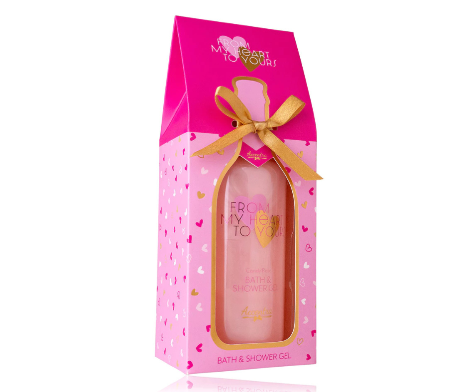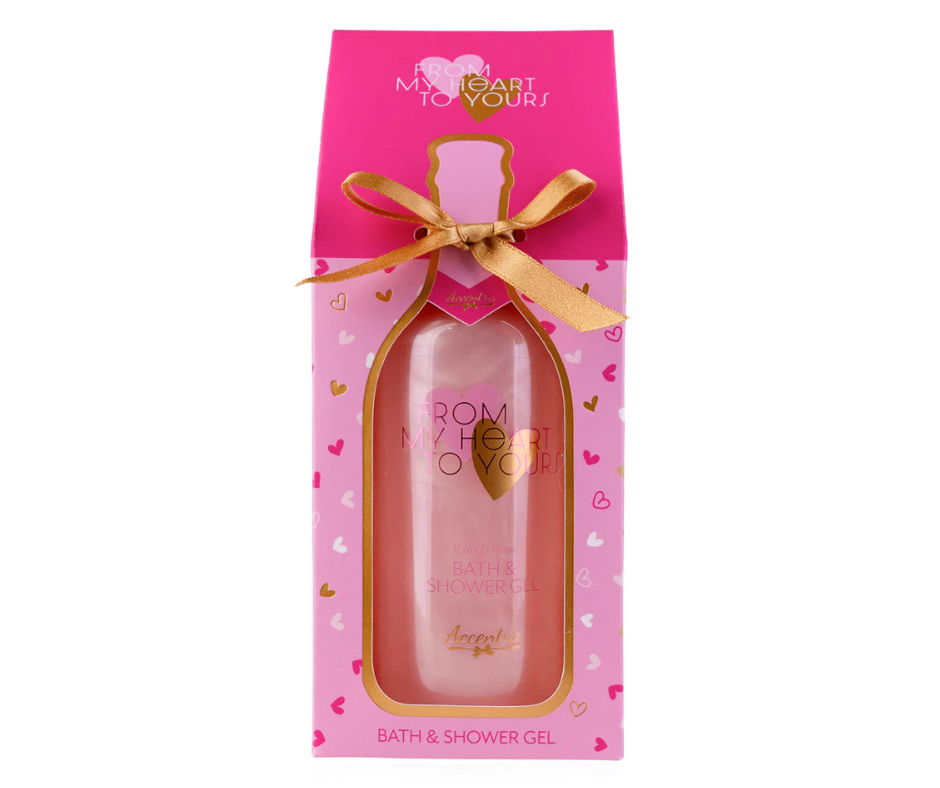 Een rijk schuimend badschuim in een elegante fles, verpakt in een luxe geschenkverpakking met champagne‑look en subtiel hartvormig design. Inhoud: 300 ml Geur: Candy Roos Kleuraccenten: roze • lila • goud