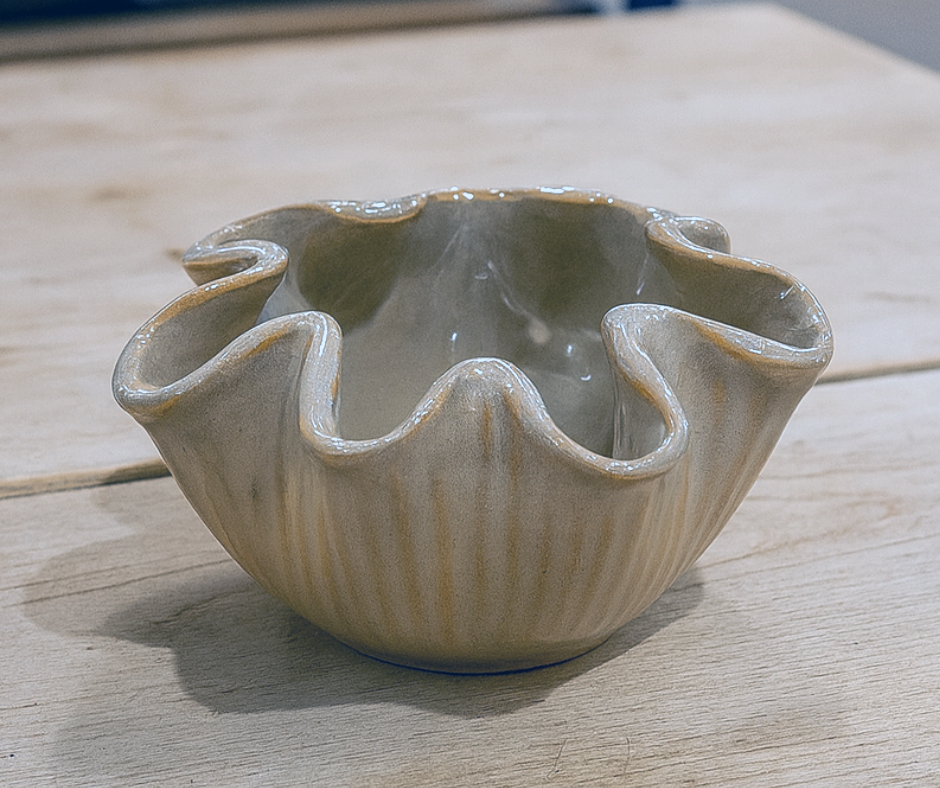 Schaal: 15x15x8 cm. aardewerk, taupe