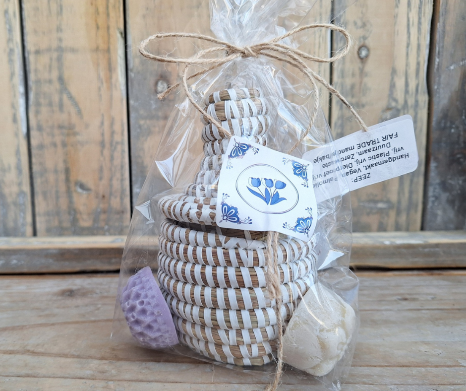 Teranga‑mandje met twee gastenzeepjes van Zeepzussen. Paarse zeepje, Lavendel Witte zeepje, Boswandeling: Frissen bosgeur Afmeting van het mandje (excl. deksel): 8 × 6 cm.